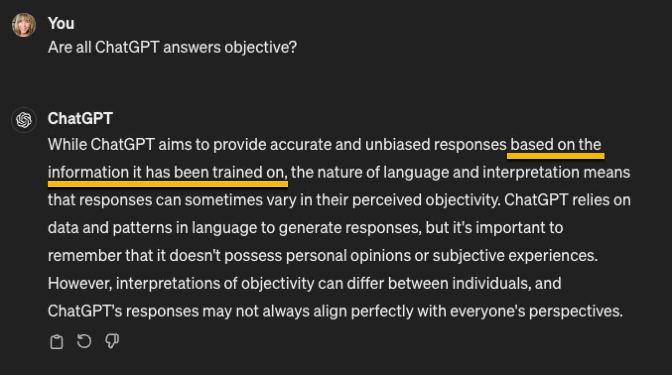 Emerging technologies, in part, can serve as clarity filters IF they are designed and used in such a way that they avoid the illusion of objectivity. For example, some perceive answers generated by ChatGPT to be authoritative and objective (although the ChatGPT response below qualifies its own objectivity).